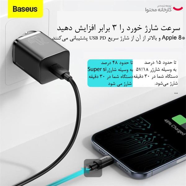 شارژر دیواری Baseus مجهز به فناوری GaN است که استفاده از آن را راحت می کند. اگرچه اندازه جمع و جور آن ممکن است شما را شگفت زده کند، فریب نخورید. این شارژر با وجود اندازه کوچکش، قدرت واقعی را پنهان می کند. با 20 وات قادر است گوشی شما را تنها در 26 دقیقه تا 50 درصد شارژ کند. برای کسانی که از کارایی و عملی بودن قدردانی می کنند عالی است. این شارژر گواه این است که قدرت فوق العاده می تواند در یک بسته کوچک جا شود.