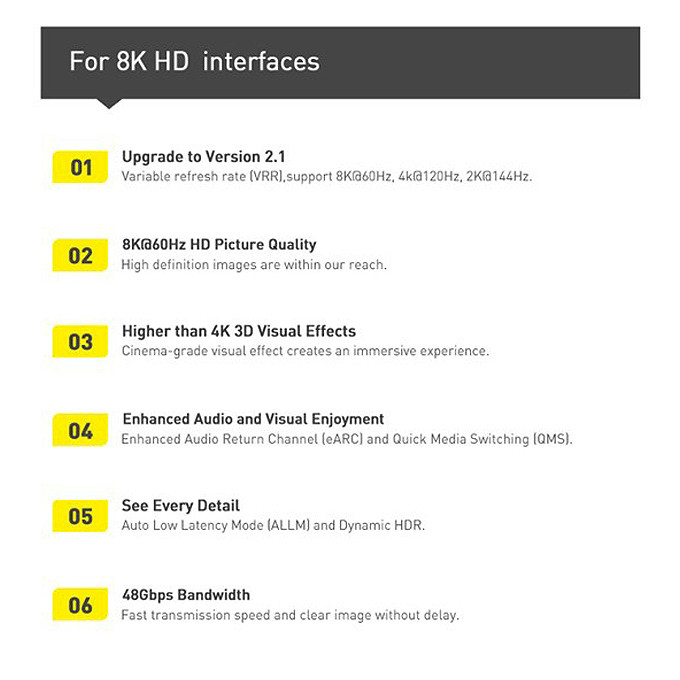 در انتها باید رزولوشون 4320 × 7680 کابل و پشتیبانی از کیفیت UHD آن را نیز بیان کنیم که باعث شفافتر شدن و وضوح بیشتر تصاویر است. این کابل از کیفیت 8K@60Hz و 4K@120Hz و 2K@144Hz پشتیبانی میکند و دارای HDR است. HDR دینامیک این کابل باعث میشود که امکان نشان دادن کیفیت بالاتری از رنگ برای شما وجود داشته باشد و همینطور روشنایی بهتری نیز برای رنگها پدید خواهد آمد.