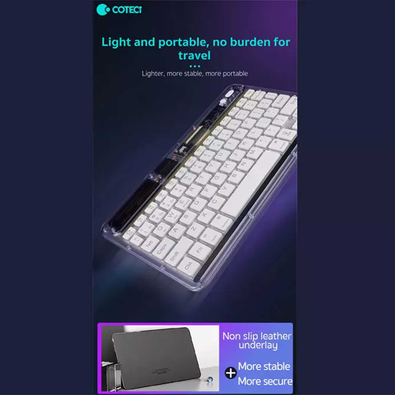کار کردن با کامپیوتر، گوشی همراه و تبلت کاری اجتنابناپذیر است و ممکن است در طول روز با همه آن سروکار داشته باشیم؛ پس بهتر است برای استفاده راحتتر و همین طور سریعتر انجام شدن کارها از یک کیبورد استفاده شود.با پیشرفت تکنولوژی و اینترنتی شدن اکثر مشاغل استفاده از کامپیوتر نسبت به گذشته بیشتر شده است. داشتن یک کیبورد با کیفیت میتواند روند کاری شما را افزیش دهد. به علاوه کار کردن طولانی مدت با آن موجب خستگی شما نمیگردد.کیبورد کوتتسی مدل 84008 با طراحی زیبا، بسیار خوش دست میباشد و کار با آن راحت و لذت بخش است.صفحه کلید Coteetci Bluetooth Crystal keyboard 84008 رنگ های مختلفی دارد؛ وزن آن فقط 247 گرم است و طراحی جذاب با کلیدهایی در ارتفاع کم دارد که باعث شده صدای اضافه و اذیتکنندهای هنگام تایپ کردن نداشته باشد. بدنه آن را پلاستیک بادوام ABS تشکیل داده و در برابر آسیب بسیار مقاوم است.همچنین کلیدها ساختار X پای قیچی دارند و نیرو به طور یکنواخت وارد میشود و این ساختار تلاش و خستگی کمتر را به همراه دارد.انتهای آن با چرم ضد لغزش پوشانده شده تا در جای خود ثابت باقی بماند. همچنین در طراحی آن چراغ 7 رنگ هم وجود دارد که جذابیت آن را چند برابر کرده است.کیبورد بیسیم کوتتسی مدل 84008 از قابلیت اتصال سهحالته برخوردار بوده و بهشما اجازه میدهد تا آن را بهطور همزمان به 3 دستگاه متصل کنید؛ با سیستمعاملهای اندروید، iOS و اندروید سازگار است.بهعلاوه این محصول دارای یک باتری لیتیومی 500 میلیآمپرساعتیست که از طریق درگاه Type-C شارژ میشود. زمان مورد نیاز برای شارژ کامل 2.5 ساعت بوده و تا 60 روز البته بدون نور پس زمینه پاسخگوی شارژ باتری خواهد بود.درگاه ارتباطی این کیبورد بلوتوث و کابل تایپ سی میباشد