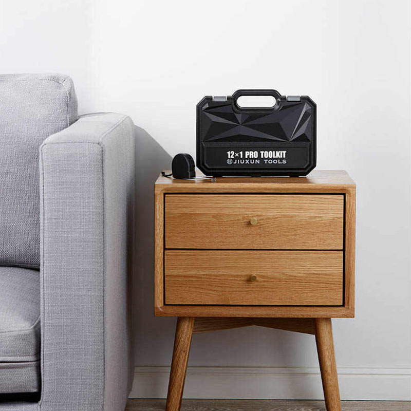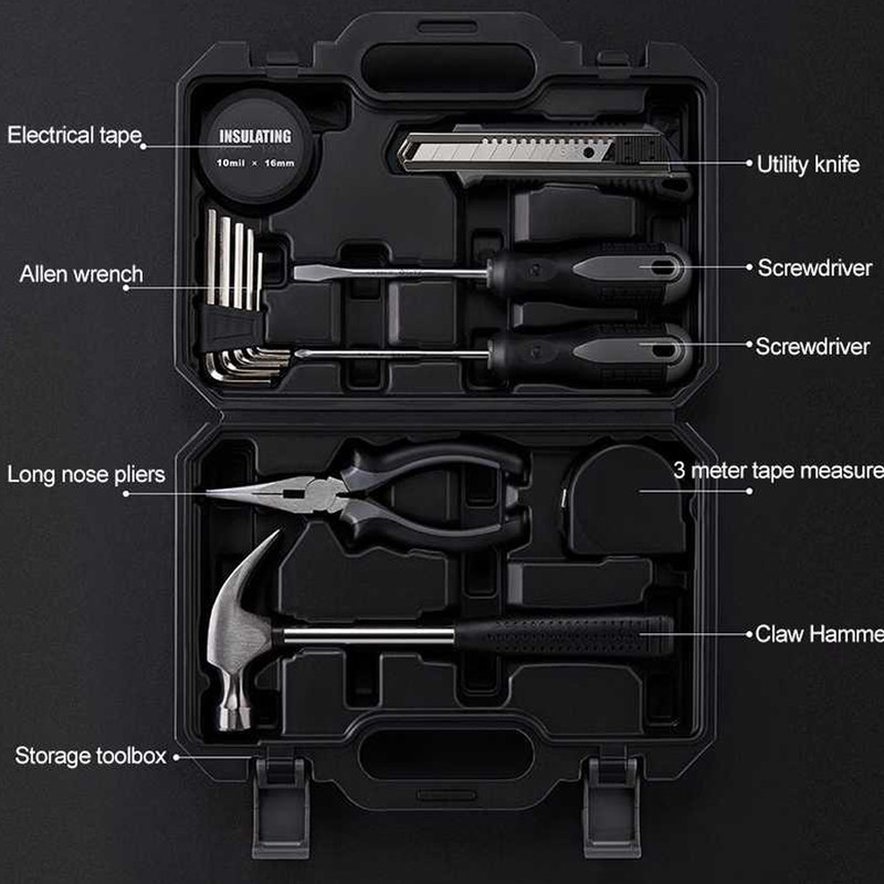 توضیحات تکمیلی مجموعه ابزار: در داخل باکس مجموعه 12 عددی ابزار مدل JIUXUN ، یک چکش، یک پیچ گوشتی، یک دم باریک، یک متر اندازه گیری با طول 3 متر، یک کاتر، 5 عدد آچار آلن، یک پیچ گوشتی دو سو و یک چسب برق قرار دارد که در شرایط مختلف می توانید از آن ها استفاده کنید.