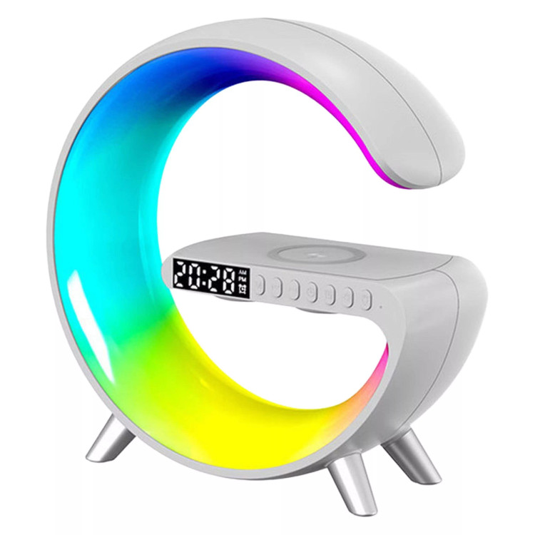 چراغ خواب هوشمند RGB مدل G63 طرح اسپیکر دار ، یک گجت چندکاره است که علاوه بر یک چراغ خواب جذاب با افکت های نوری RGB ، قابلیت نمایش ساعت و تنظیم ساعت بیدار شدن و کوک کردن ساعت و همچنین قابلیت شارژ کردن وایرلس موبایل را دارد . از قابلیت جذاب دیگه این محصول که آن را خاص میکند ، اسپیکر های این چراغ خواب است که میتوانید قبل از خواب موزیک دلخواه خودتون رو از طریق بلوتوث پخش کنید. برای تنظیم ساعت این دستگاه کافیه یکبار به یک تلفن همراه (از طریق بلوتوث) متصل کنید تا ساعت دستگاه تنظیم شود . این دستگاه برای روشن شدن نیاز به آداپتور 20 وات دارد که میتوانید از آداپتور های موبایل این وسیله را شارژ و یا روشن کنید.