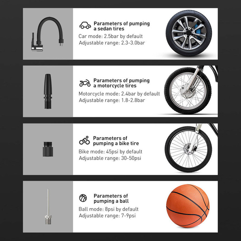 دارای یک کابل شارژر فندکی برای شارژ، یک سری اتصال برای باد کردن، سه سری مختلف، دفترچه راهنما
