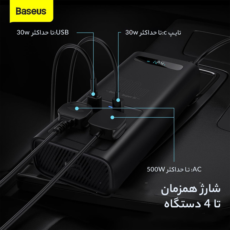 مبدل برق خودرو Baseus مدل Power Inverter 500W، یک مبدل ولتاژ است که برق مستقیم خودرو را به ولتاژ مطلوب برای راهاندازی دستگاههای برقی مانند چراغ روشنایی، لپتاپ، پنکه، دریل، پروژکتور، چایساز، آبمیوهگیری، پمپ آب، اسپیکر و ...، تبدیل کرده و با همراه داشتن آن در کمپهای تفریحی، طبیعت گردی، پیک نیک و ...، قادر خواهید بود بدون نیاز به ژنراتور برق، وسایل برقی مورد نیاز خود را به راحتی مورد استفاده قرار دهید.