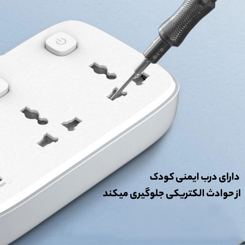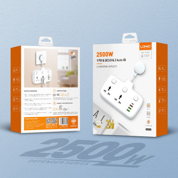 دارای 2 خروجی برق از نوع Universal | حداکثر توان خروجی برق 2500 وات | حداکثر توان خروجی شارژ 20 وات | 1 خروجی Type C و 3 خروجی USB | قابلیت شارژ سریع PD و QC 3.0 | ضد آب و مقاوم در برابر گرمای بالا
