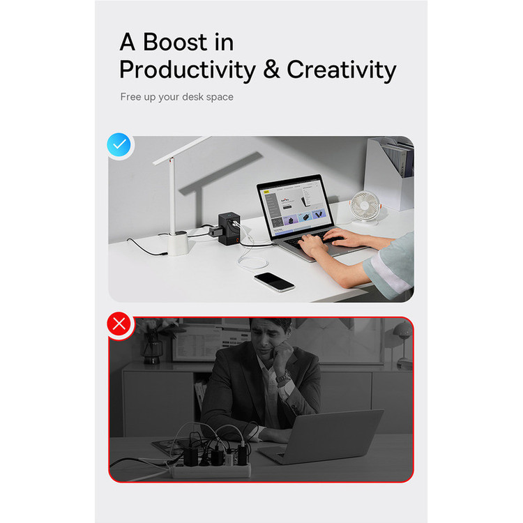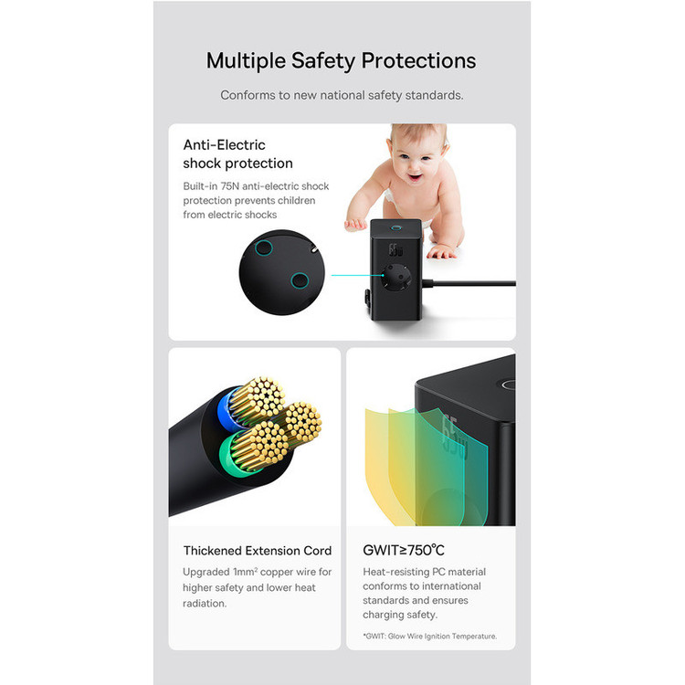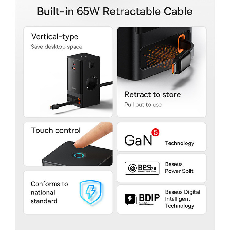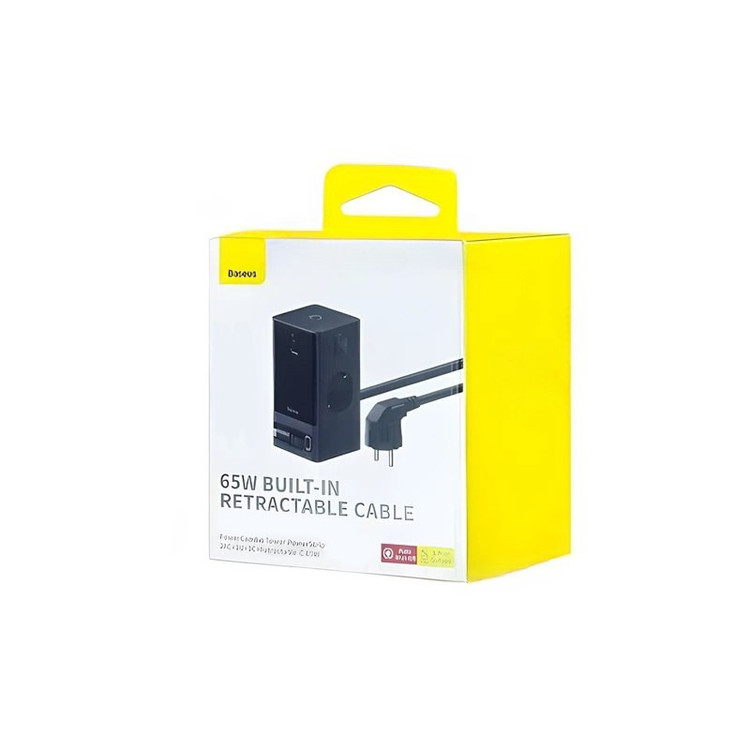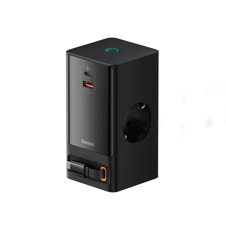 کالای اورجینال بیسوس، واردات انحصاری تیم تکنیک تل | دارای یک کابل Type-C متصل به بدنه برای شارژ | حداکثر توان خروجی شارژ 65 وات | دارای 10 لایه محافظتی | نوع دوشاخه EU / ایرانی | دارای 2 پریز برق + USB-C + USB