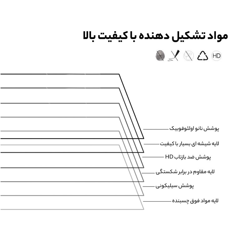 ویژگیها: 9H , جلوگیری از انعکاس نور , قابلیت نصب آسان , مقاوم در برابر چربی و اثرانگشت , مقاوم در برابر خط و خش , نصب بدون حباب
