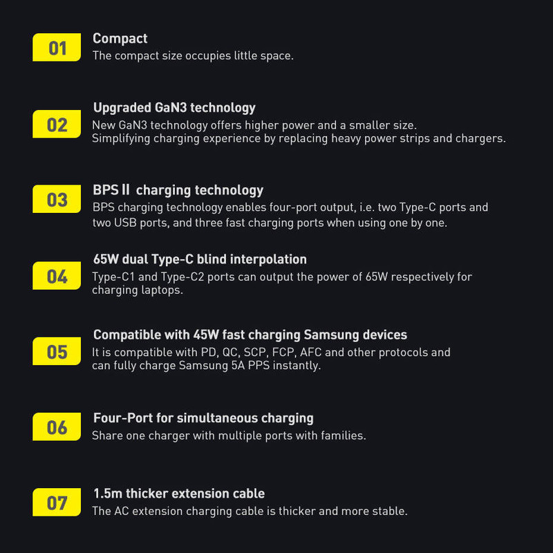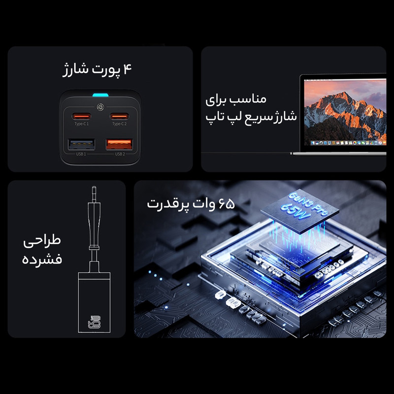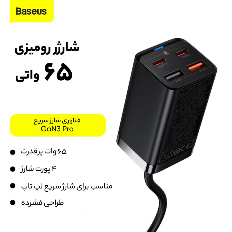 این روزها که استفاده از تکنولوژی به یکی از مهمترین نیازهای بشر تبدیل شده است، لوازمهای برقی جایگاه ویژهای در زندگی همه پیدا کردهاند و پر بودن باتری آنها به یک دغدغه تبدیل شده است؛ خصوصا هنگامی که باتری آنها به صورت همزمان نیاز به دریافت انرژی داشته باشند. پیشنهاد امروز شارژر چهار پورت Baseus مدل GaN3 Pro می باشد که در چنین شرایطی نیاز به شارژری داریم که پاسخگوی تامین انرژی چند دستگاه به صورت همزمان باشد. کمپانی فعال بیسوس در عرصه تولید انواع شارژرهای فست، آداپتوری را طراحی کرده که با داشتن چهار پورت قادر به شارژ همزمان چهار دستگاه است. با توجه به جسه کوچک و ابعاد 40x70x36 میلیمتری که دارد از توان 65 وات برخوردار بوده و قادر به شارژ دستگاه شما در کوتاهترین زمان ممکن است. در طراحی این شارژر دیواری بیسوس از فناوری گالیوم نیترید استفاده شده که دارای ویژگیهای پهنای باند بالا، رسانایی گرمایی زیاد، مقاومت گرمایی قابل توجه، مقاومت تابشی، مقاومت در برابر اسید و قدرت و استحکام بالا است.