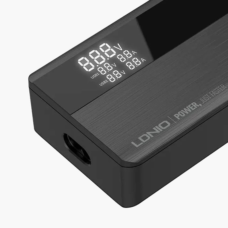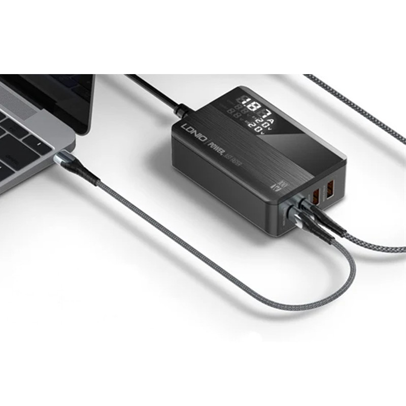 شارژر LDNIO A4809C با حداکثر توان خروجی 100 وات و داشتن 4 پورت خروجی متشکل از 2 عدد USB و 2 عدد Type C می تواند انتخاب خوبی برای میز کارتان باشد. این شارژر رومیزی با فناوری ساخت گالیم نیترات GaN طراحی شده است و از مواد PC نسوز تا 850 درجه سانتیگراد ساخته شده است و به عنوان هاب شارژر مورد استفاده قرار می گیرد. روی بدنه آن یک صفحه نمایش دیجیتالی قرار گرفته تا میزان ولتاژ و شدت جریان شارژ را به شما نمایش دهد.