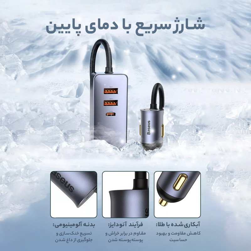 این شارژر با کابل 1.5 متری و تقسیمکنندهای که دارد، به شما این امکان را میدهد که به طور همزمان چهار دستگاه را شارژ کنید. یکی از پورتها به صورت مستقیم به شارژر فندکی متصل است، در حالی که تقسیمکننده با سه پورت USB-A و یک پورت USB-C امکان دسترسی به دستگاههای اضافی را فراهم میآورد.