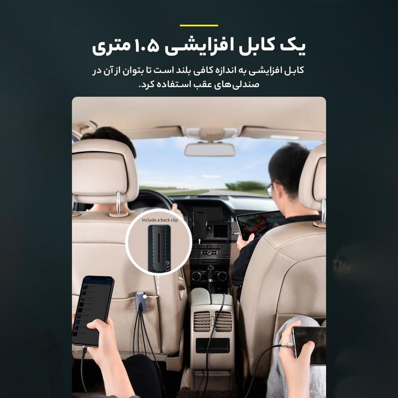 استفاده در صندلیهای عقب: کابل 1.5 متری به شما این امکان را میدهد که تقسیمکننده را به راحتی به صندلیهای عقب منتقل کنید تا مسافران عقب نیز بتوانند دستگاههای خود را شارژ کنند.